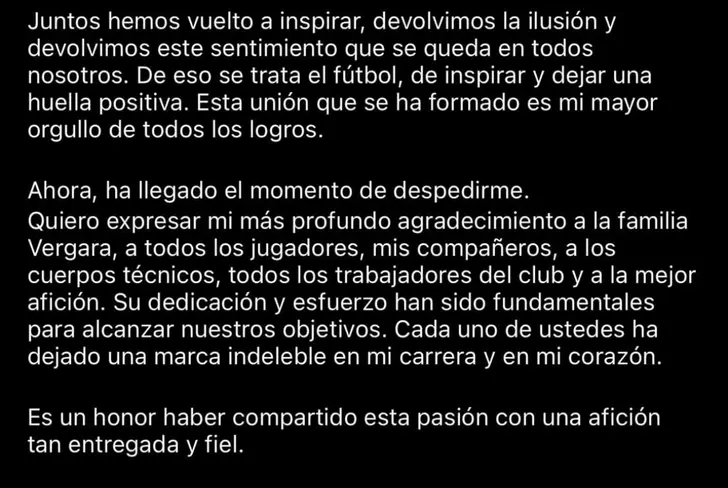 Quiero expresar mi más profundo agradecimiento a la familia Vergara, a todos los jugadores, mis compañeros, a los cuerpos técnicos, todos los trabajadores del club y a la mejor afición. Su dedicación y esfuerzo han sido fundamentales para alcanzar nuestros objetivos. Cada uno de ustedes ha dejado una marca indeleble en mi carrera y en mi corazón.