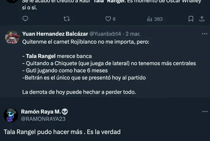 Uno. De los futbolistas que ha sido muy criticado por la hinchada del Guadalajara, ha sido Raúl El Tala Rangel, el guardameta lo acusan de no haber hecho lo suficiente por detener los goles del cruz azul, e incluso la señalan como uno de los futbolistas que ya no debe de ser titular, los refaccionados aseguran que ahora es el momento de Oscar Wally y tal parece que Fernando Gago escucharía estas peticiones y le dará minutos como titular al Cancerbero con triple nacionalidad, quien había sido el titular en la Concacaf Champions Cup, y tal parece que el argentino le respetará su lugar en este torneo, las peticiones de los aficionados se cumplirán y veremos a Whalley arrancar el titular contra el América.