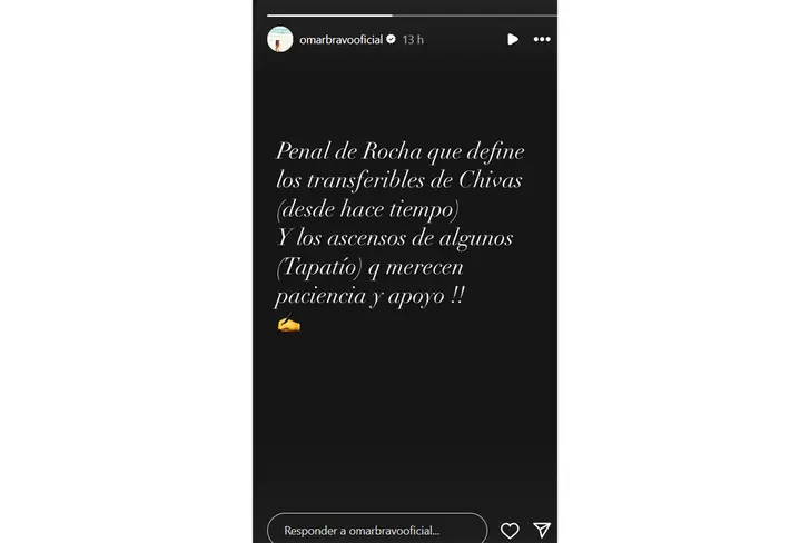 A través de una historia en Instagram, Bravo expresó su descontento con el desempeño del equipo y lanzó un dardo envenenado hacia la directiva. El exfutbolista publicó: "Penal de Rocha que define los transferibles de Chivas (desde hace tiempo) Y los ascensos de algunos (Tapatío) que merecen paciencia y apoyo!!".