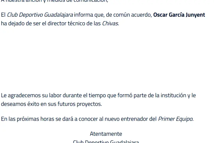 "El Club Deportivo Guadalajara informa que, de común acuerdo, Oscar García Junyent ha dejado de ser el director técnico de las Chivas. Le agradecemos su labor durante el tiempo que formó parte de la institución y le deseamos éxito en sus futuros proyectos", reza el comunicado.