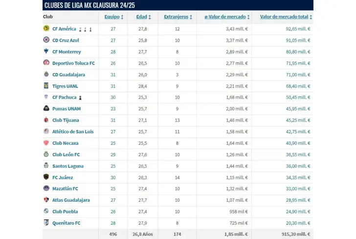 Según Transfermarkt, Chivas se ubica en el quinto lugar de la Liga MX en cuanto a valor de plantilla, con un valor de 71 millones de euros. Esta cifra se debe, en gran medida, a las recientes incorporaciones de jugadores como Alan Pulido, Luis Romo y Miguel Tapias.