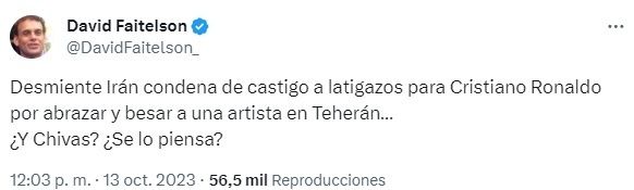 “Desmiente Irán condena de castigo a latigazos para Cristiano Ronaldo por abrazar y besar a una artista en Teherán… ¿Y Chivas? ¿Se lo piensa?”.