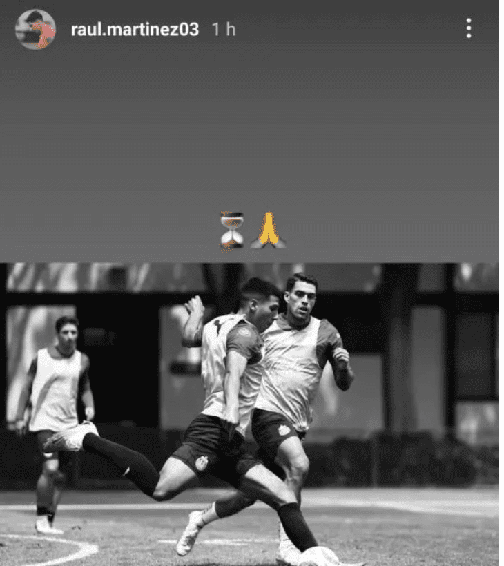 Tanto Alexis vega como Cristian Calderón ya se habían hecho presentes a través de su red social Instagram, dando indirectas de que estaban arrepentidos coma y después enviando una disculpa pública como se los habían solicitado ahí también apareció Raúl Martínez asegurando que ya se había disculpado con la directiva cuerpo técnico y sus compañeros, ahora el juvenil posteó una enigmática historia a través de su red social, en ella se puede apreciar al futbolista disputando el balón con Daniel Ríos en una práctica con el primer equipo, la fotografía está acompañada con un reloj y unas manos, en señal de que su regreso al terreno de juego está cerca, pues ya se les pudo ver entrenando en Verde Valle, y tal parece que tras la lesión del Chiquetete Orozco podría volver a recibir minutos de Veljko Paunovic.
