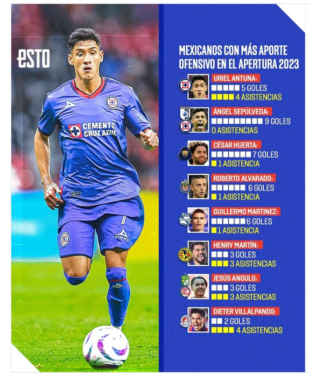 Además de los casos de César Huerta, que hoy es uno de los mejores extremos de la liga y de Antuna que está enrachado en la Selección Mexicana, que si hubieran mostrado ese nivel que tienen actualmente, Chivas tendría un equipazo, pues hay que recordar todo lo que se pagó por el Brujo, que ha sido uno de los fichajes más caros, Uriel regsitra cinco goles y cuatro anotaciones este torneo, además de él, está el Cuate Sepúlveda, que también está con la máquina y ya registra nueve anotaciones este torneo, César Huerta registra siete goles y una anotación, el Piojo Alvarado seis goles y una asistencia, Guillermo Martínez, seis goles y una asistencia, el Canelo Angulo tres goles y tres asistencias y Dieter Villalpando dos goles y cuatro asistencias, lo que sería el rebaño si hubieses tenido a estos siete con el nivel que tienen ahora.