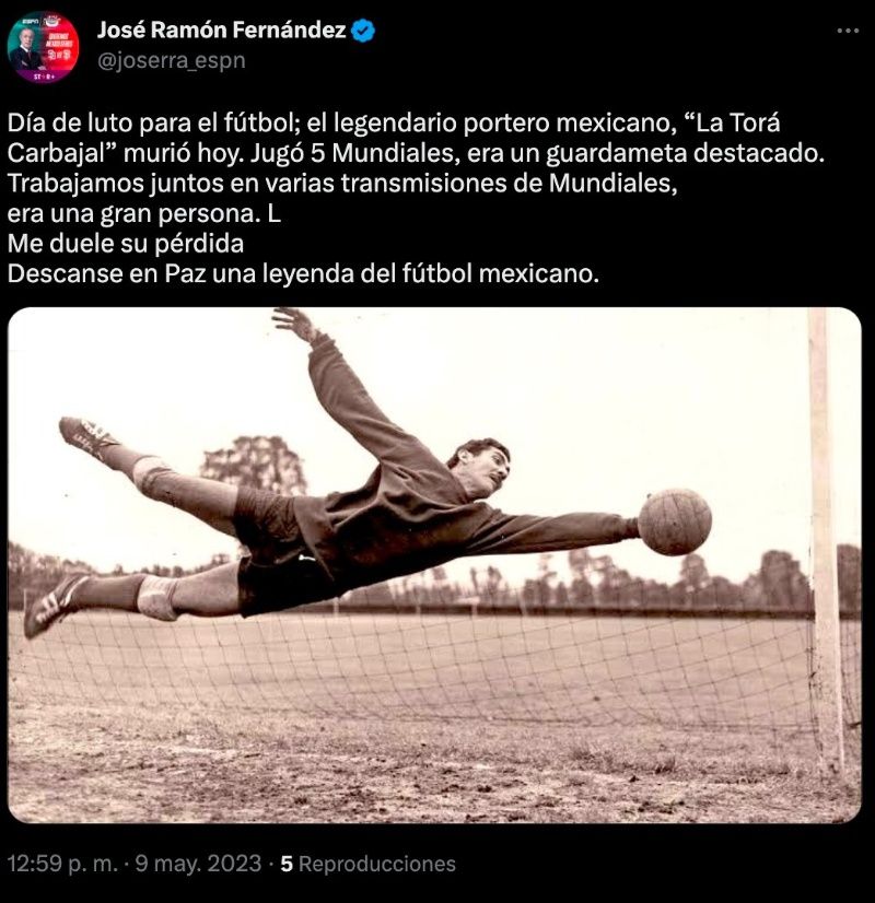 “Día de luto para el fútbol; el legendario portero mexicano, “La Tota Carbajal” murió hoy. Jugó 5 Mundiales, era un guardameta destacado. Trabajamos juntos en varias transmisiones de Mundiales, era una gran persona. Me duele su pérdida Descanse en Paz una leyenda del fútbol mexicano”.