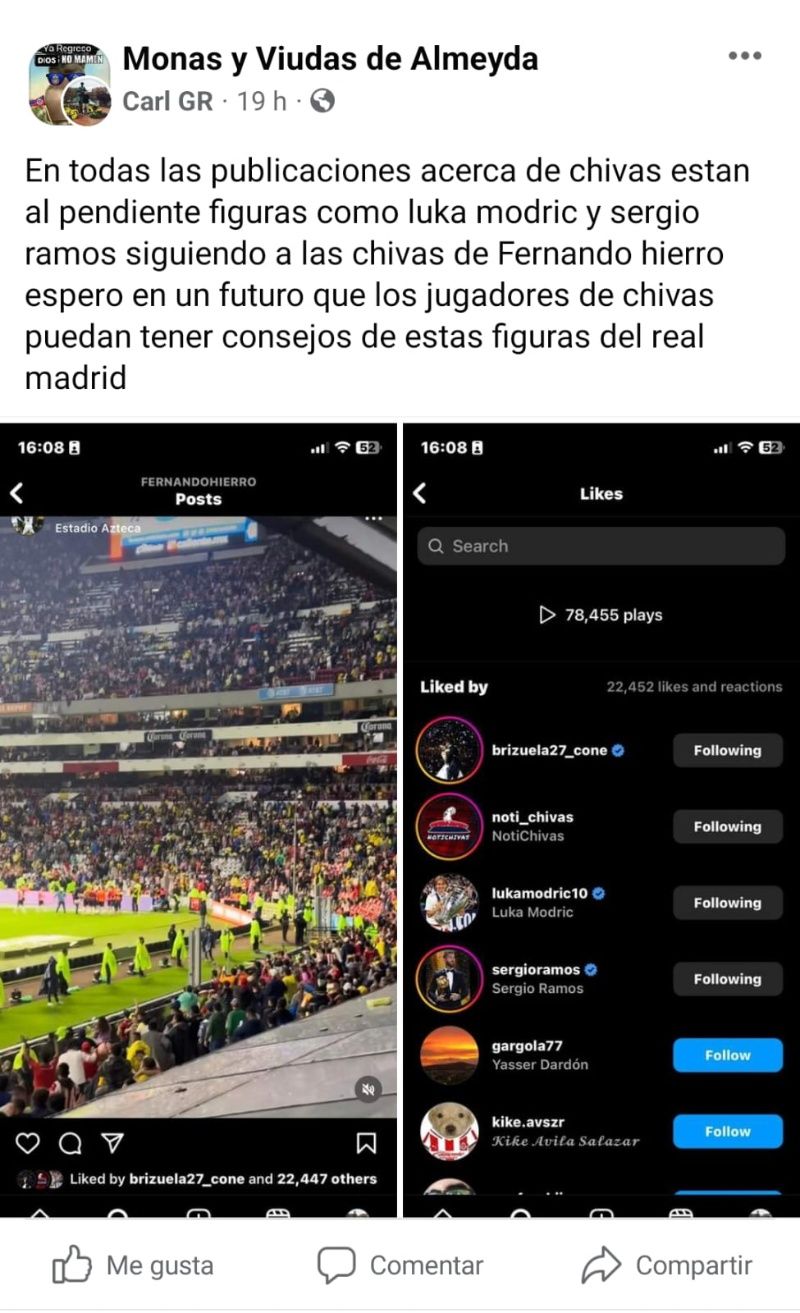 Pero la alegría de los chivahermanos no solo es en México, pues al otro lado del mundo, el campeón con Real Madrid y ganador del Balón de Oro, Luka Modric ha estado muy activo en redes sociales reaccionando a las fotos que sube Fernando hierro director deportivo de Chivas sobre los logros obtenidos por el rebaño.